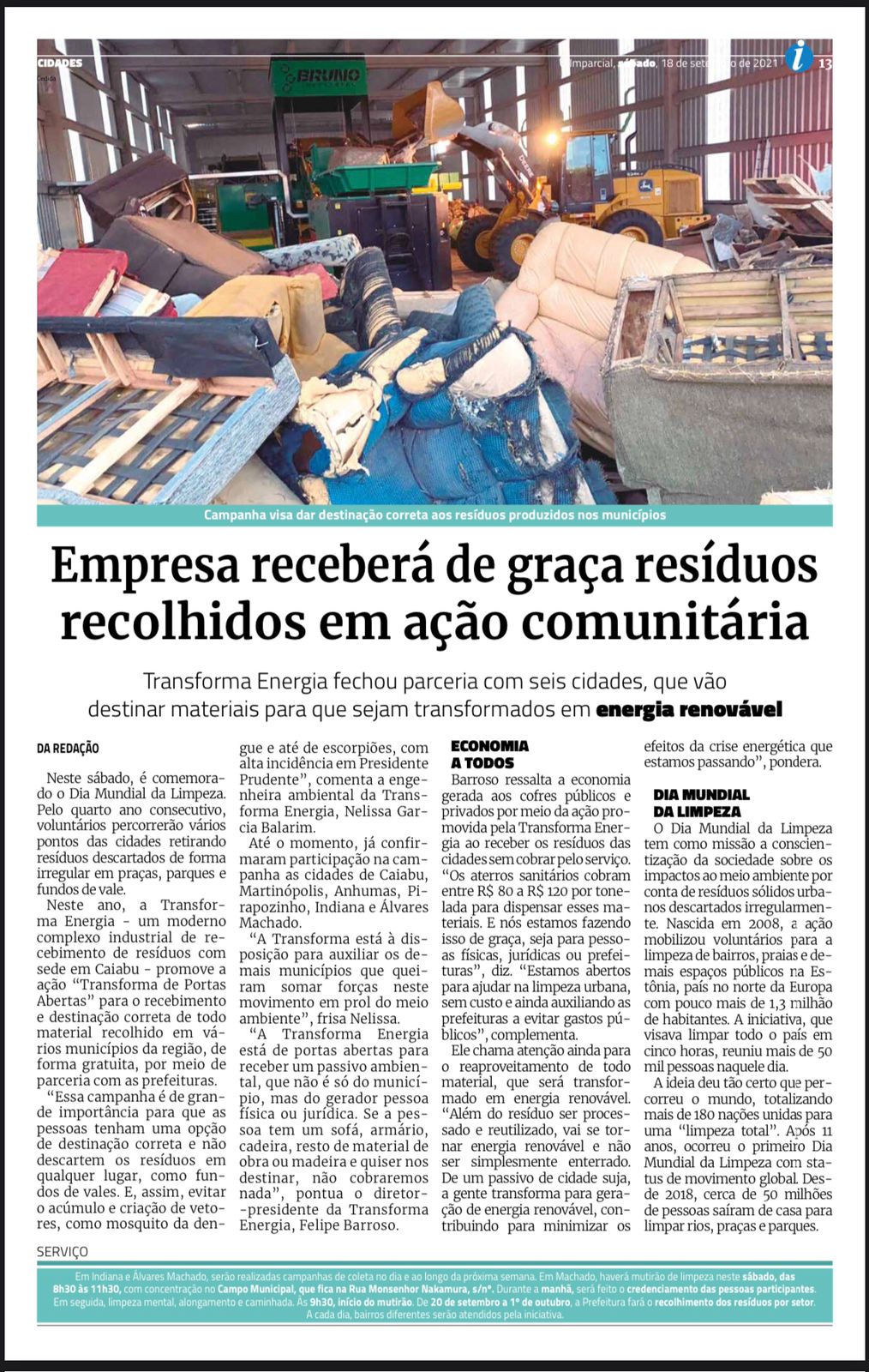 A Transforma Energia é um dos mais modernos complexos industriais de recebimento de resíduos do país, com foco principal na recuperação energética e sustentabilidade por meio do processamento, reaproveitamento, reciclagem e destinação final de rejeitos.